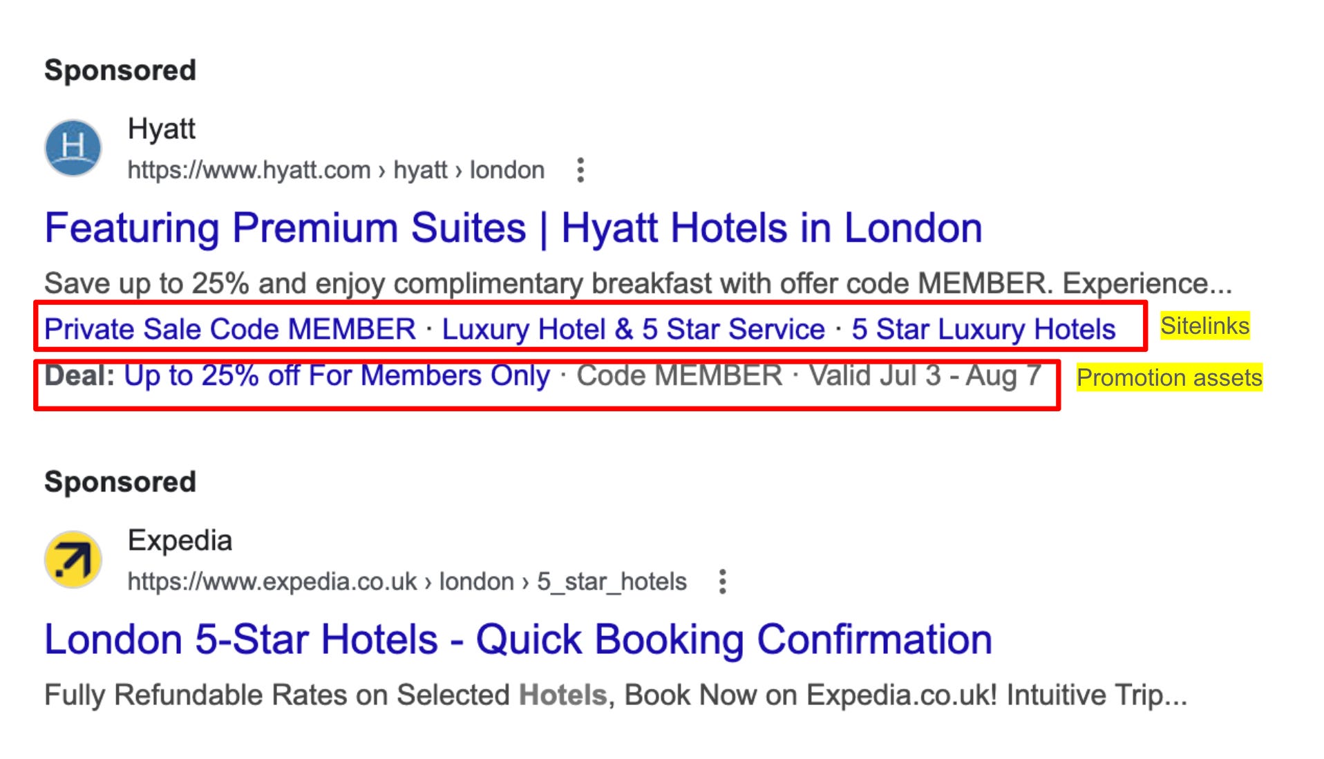As you can see in the 2 ads, the one by Hyatt has occupied substantially larger ad space as it displays additional sitelinks and promotion assets on top of the description, which means it’s more likely to be detected by users. Now Google does not guarantee showing these extensions all of the time, but it’s always recommended to include as many details as possible to facilitate machine learning.