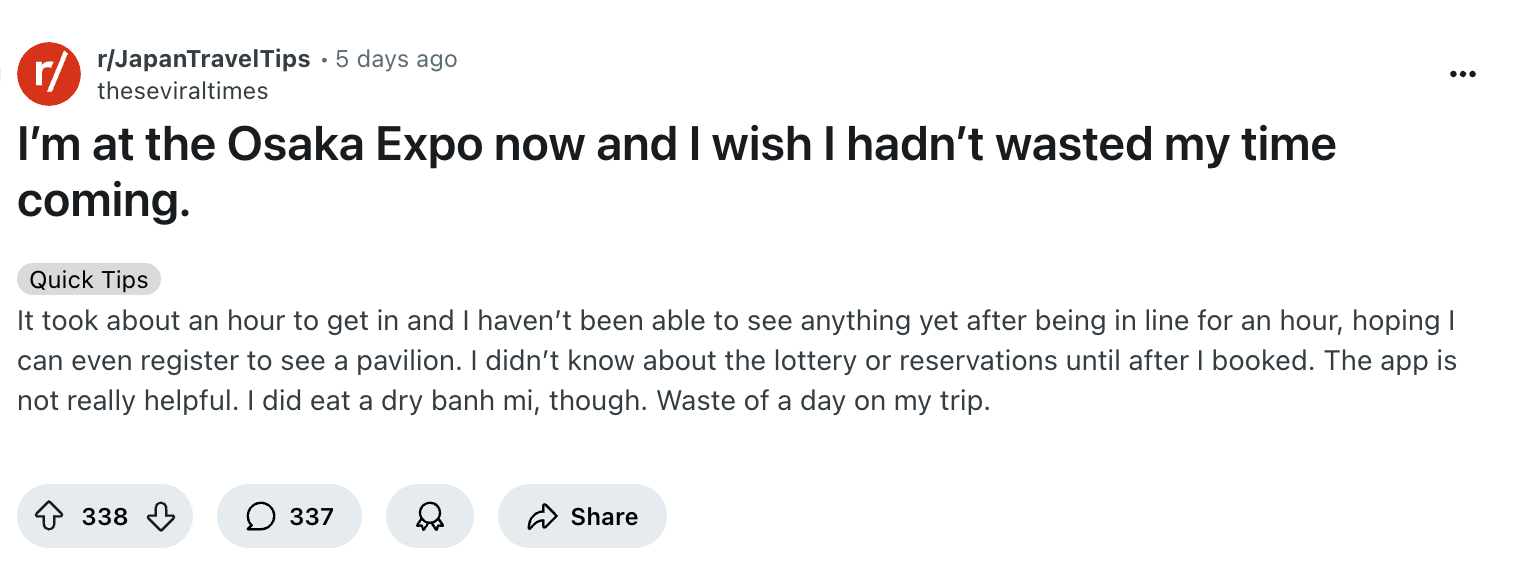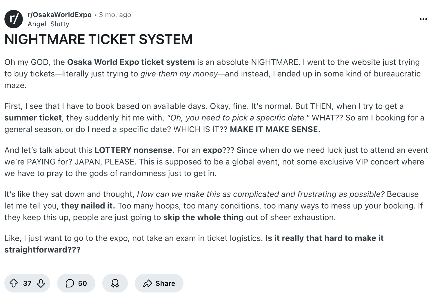 I recently visited the Osaka Expo 2025, and to be upfront, I enjoyed it a lot. But I can assure you, 99% of international visitors will give up buying tickets—the 1% are people like me who love Japan so much that they can tolerate this level of pain.