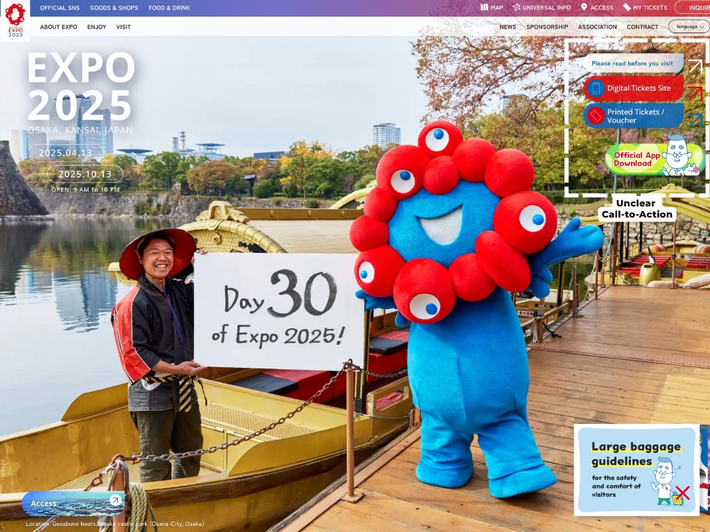 This is the Expo Website. Looking at the homepage, the website violates fundamental UX principles by hiding its most important function: buying tickets, in a sidebar rather than featuring it prominently. The design creates confusion with too many competing navigation options and buttons that all look visually similar. Notice how the critical 'Digital Tickets Site' button has the same visual weight as the non-essential 'App Download' button, making it difficult for visitors to immediately identify what action to take. This poor visual hierarchy forces users to scan the entire page rather than being naturally guided to the ticket purchase option, creating unnecessary friction especially for international visitors.
